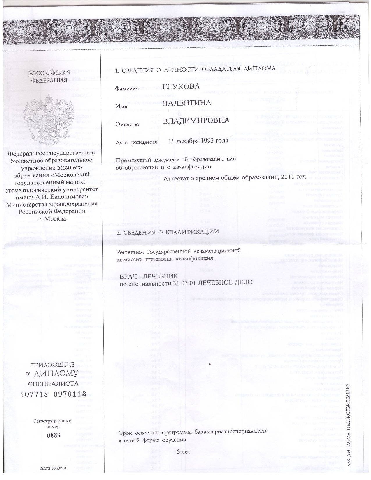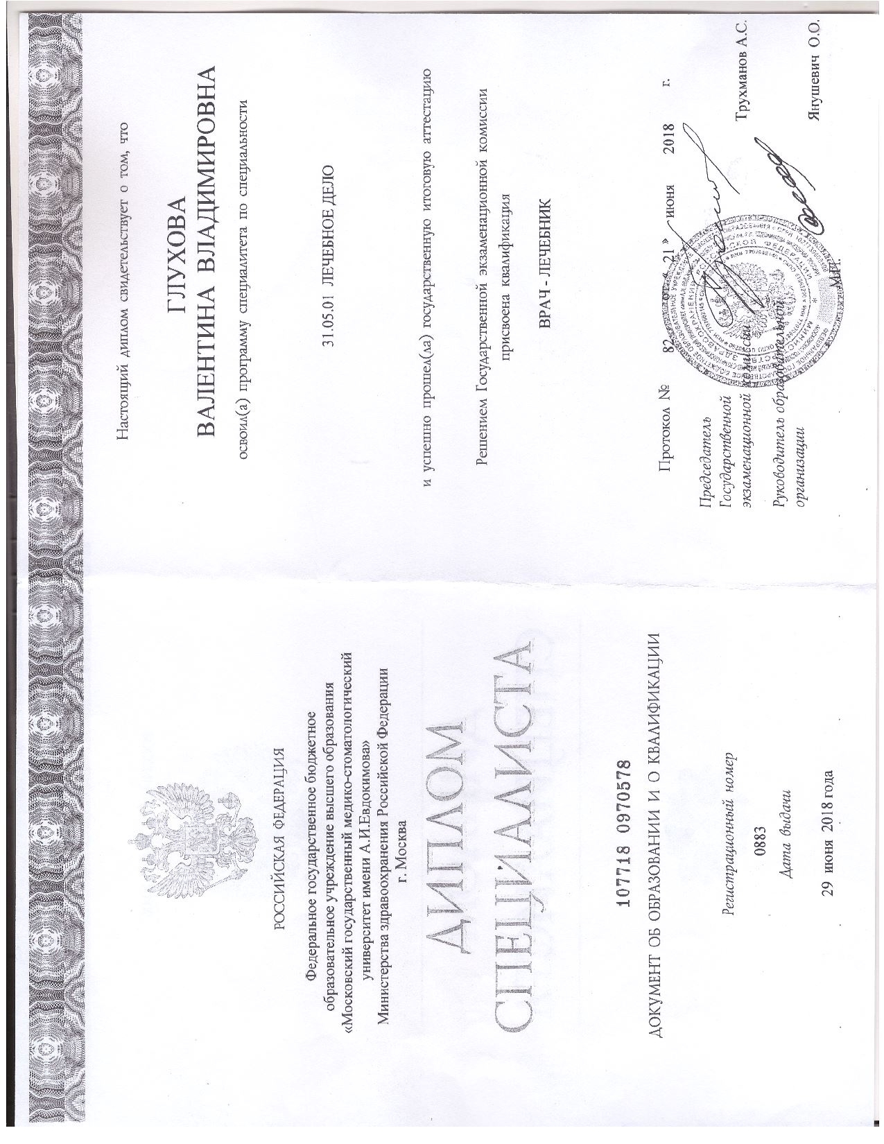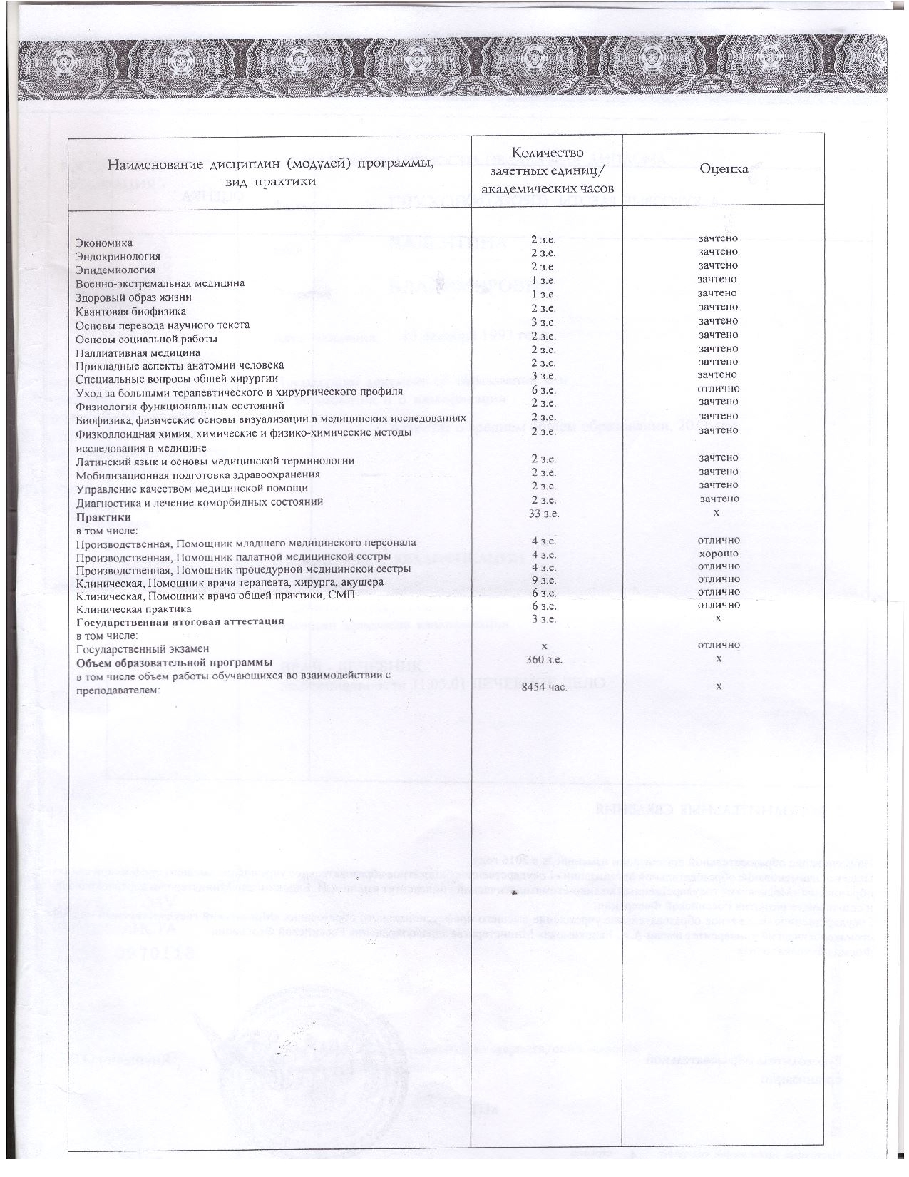 - 2018 г. — Диплом по специальности «Лечебное дело», Российский университет медицины (ex. Московский государственный медико-стоматологический университет имени А.И. Евдокимова)