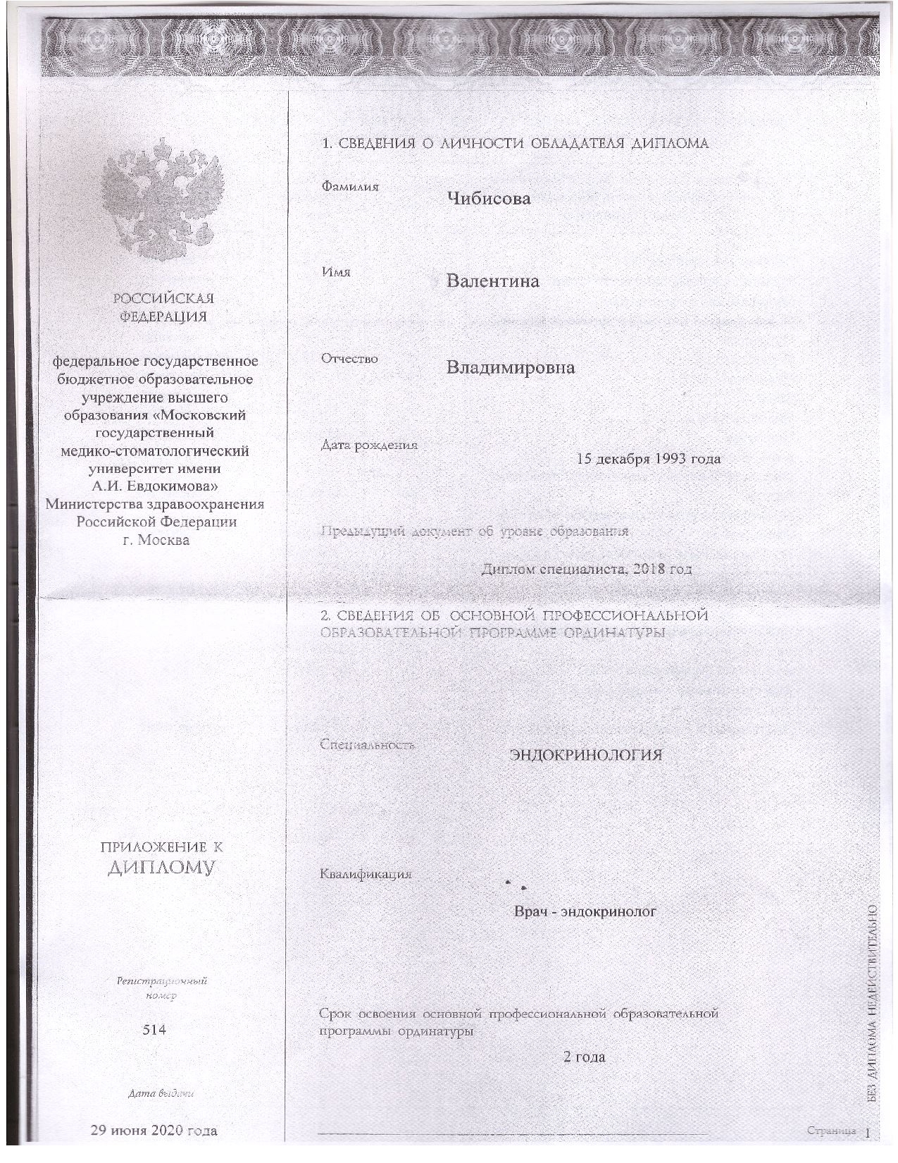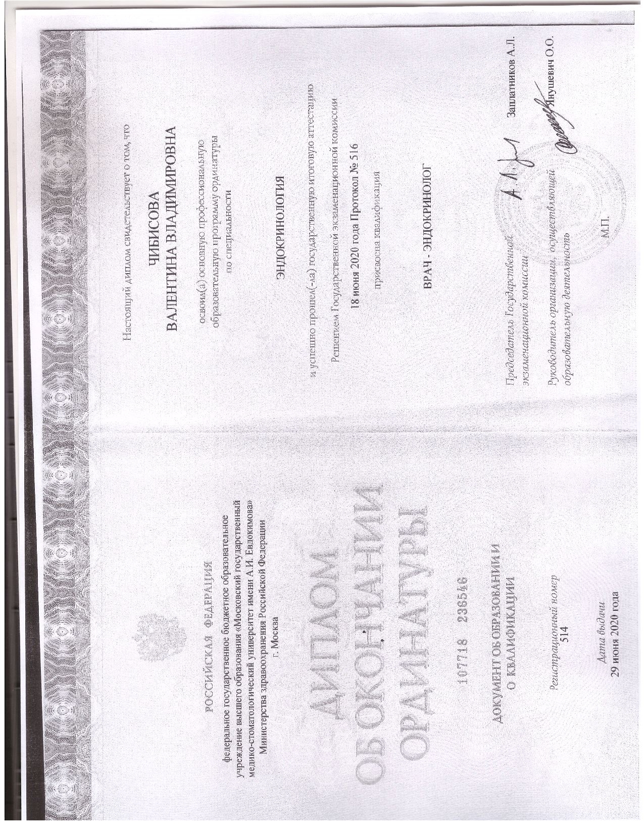 - 2020 г. — Ординатура по специальности «Эндокринология», Российский университет медицины (ex. Московский государственный медико-стоматологический университет имени А.И. Евдокимова)