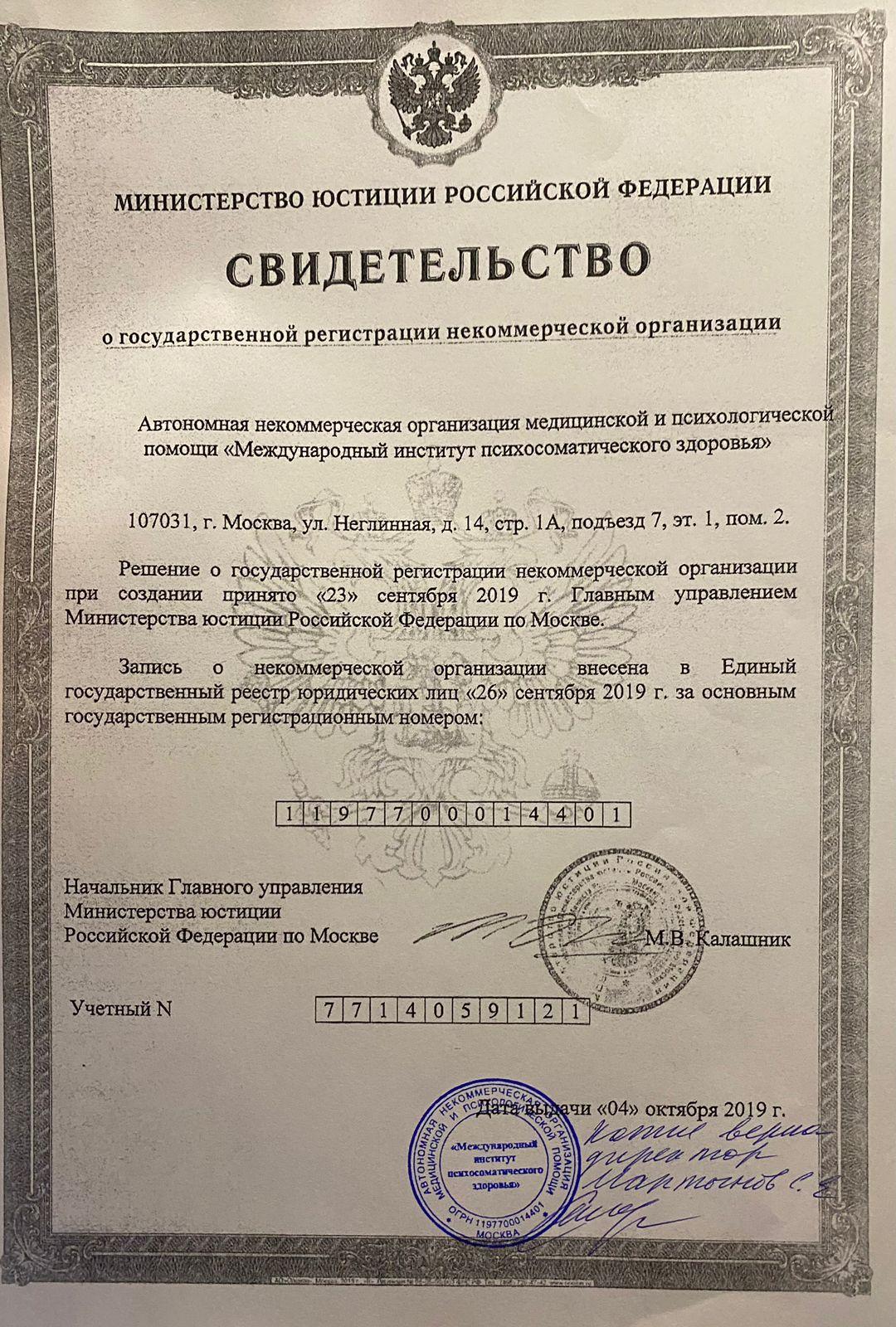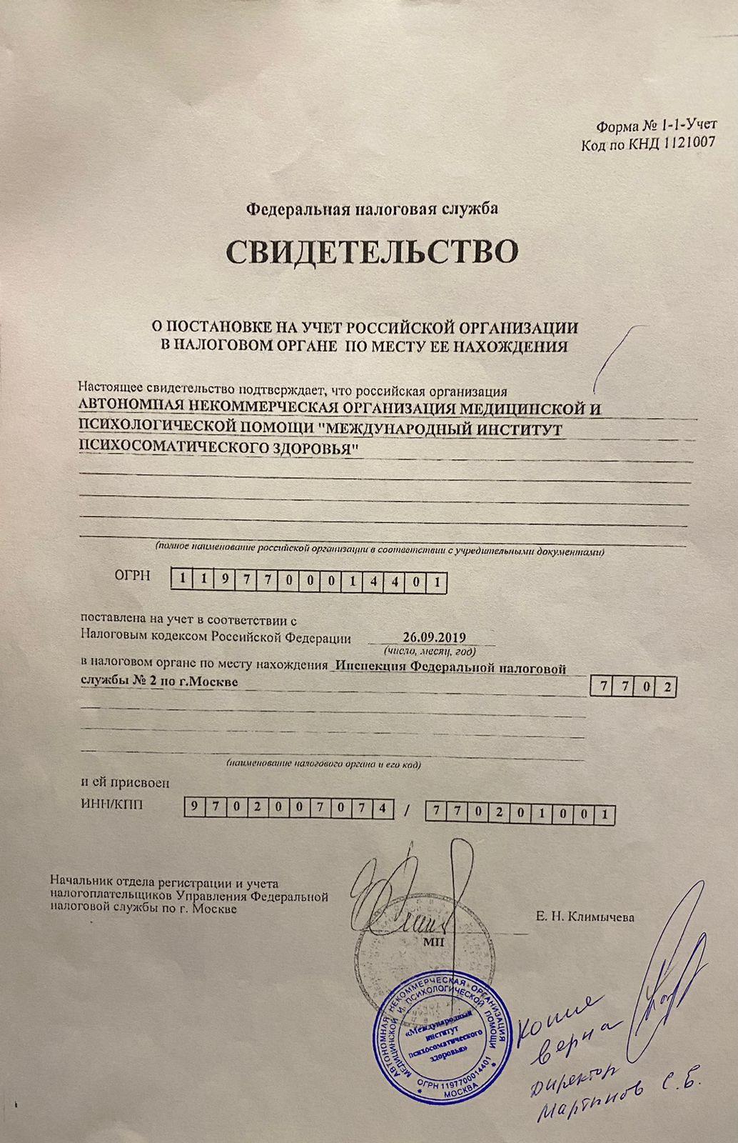 | Документы | Устав АНО “Международный институт психосоматического здоровья” Свидетельство о постановке в налоговый орган Свидетельство ОГРН |